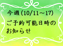 10/20(水)~10/24(日)までのご予約可能日時をお知らせ致します。 10/20(水) 午後4時以降 10/21(木) 午前10時 午後4時以降 10/22(金) 午前10時 午後5時以降 10/23(土) 午後2...